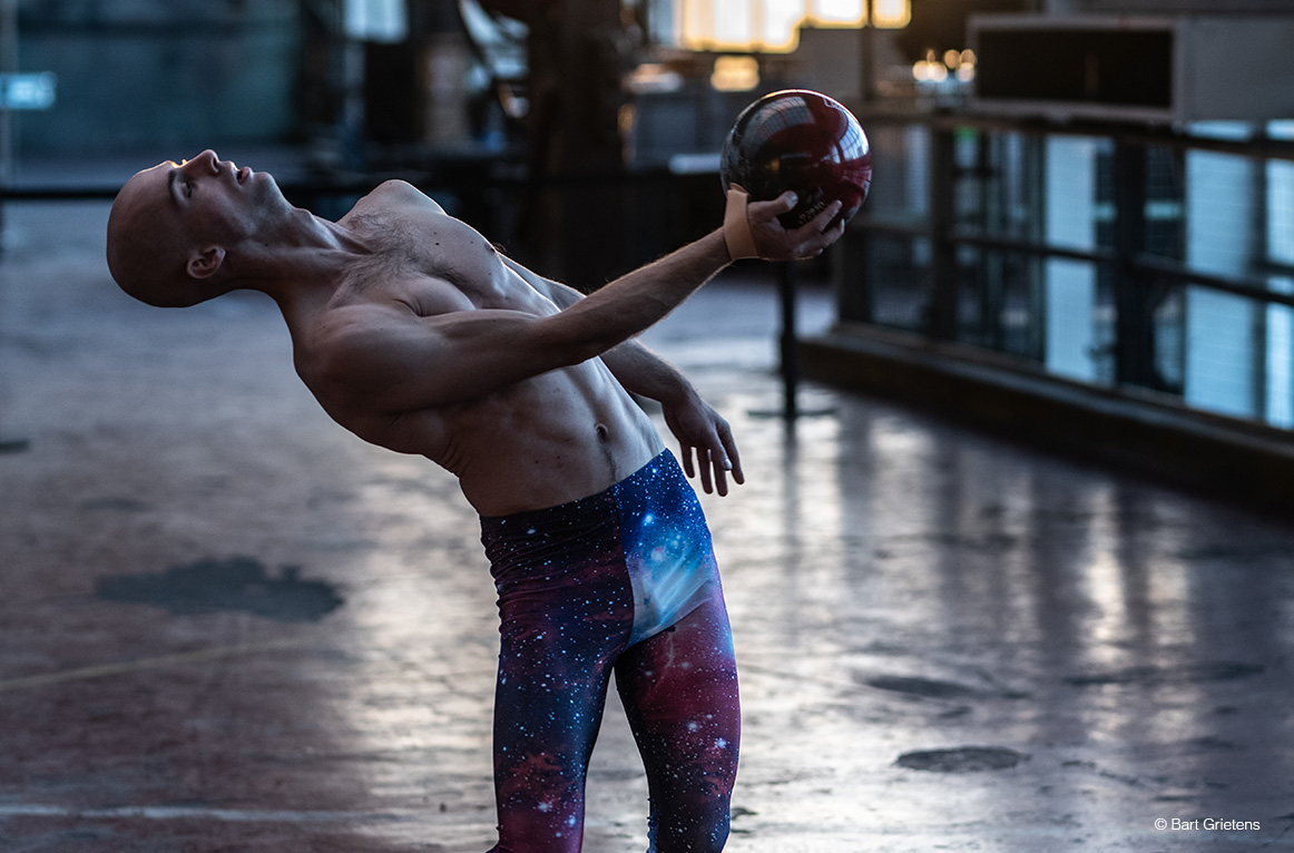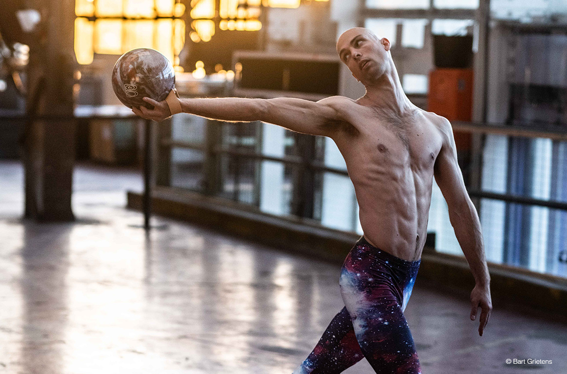 Συνήθως μια μπάλα του μπόουλινγκ έχει μία και μοναδική λειτουργία: να ρίξει όσο το δυνατό περισσότερες κορίνες στην άκρη ενός διαδρόμου. Τι θα συμβεί όμως αν αφαιρέσεις το αντικείμενο αυτό από τον φυσικό χώρο του; Σε αυτό το ντουέτο με μια μπάλα του μπόουλινγκ ο Alexander Vantournhout [Αλεξάντερ Βαντουρνχούτ] πραγματεύεται τη σχέση ανάμεσα στο σώμα και τα αντικείμενα που το περιβάλλουν. Το Bowling Ball αποτελεί μέρος του έργου SCREWS, μιας σειράς πέντε μικρο-παραστάσεων, στις οποίες τα αντικείμενα στερεώνονται στο σώμα και είτε παρέχουν στήριξη είτε διαταράσσουν την ισορροπία, επιτρέποντας στο σώμα να αψηφήσει τη βαρύτητα ή ενισχύοντας τη δράση της.